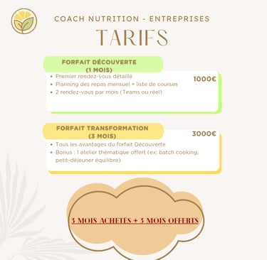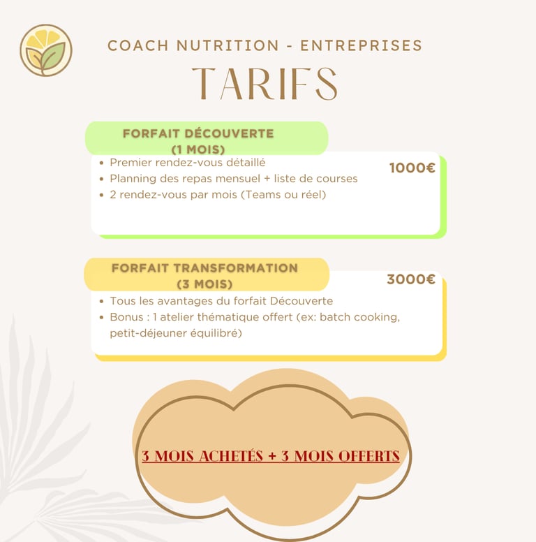 Découvrez nos grilles tarifaires pour le coaching en rééquilibrage alimentaire, pour particuliers et entreprises.